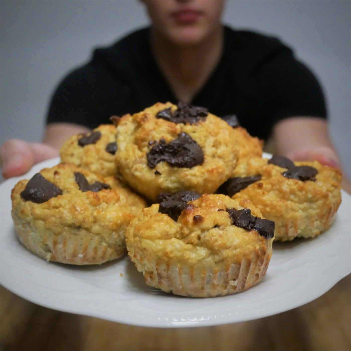 - Spray muffin tin with cooking spray and pour the mixture into the moulds and top with chocolate chips.
