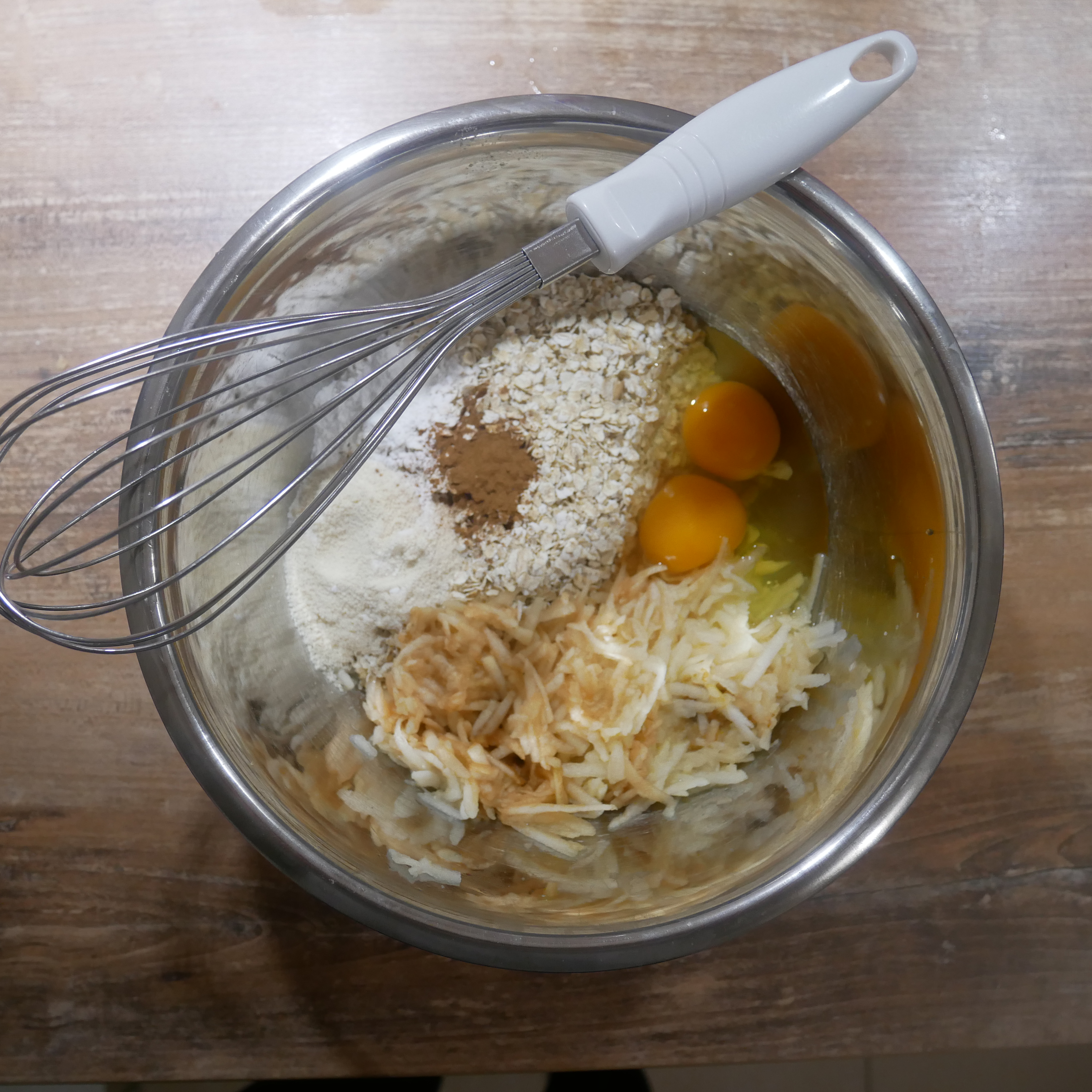 The main ingredients are 2 apples, 2 eggs, oats and protein powder. All of these ingredients are super healthy and so is the final result.