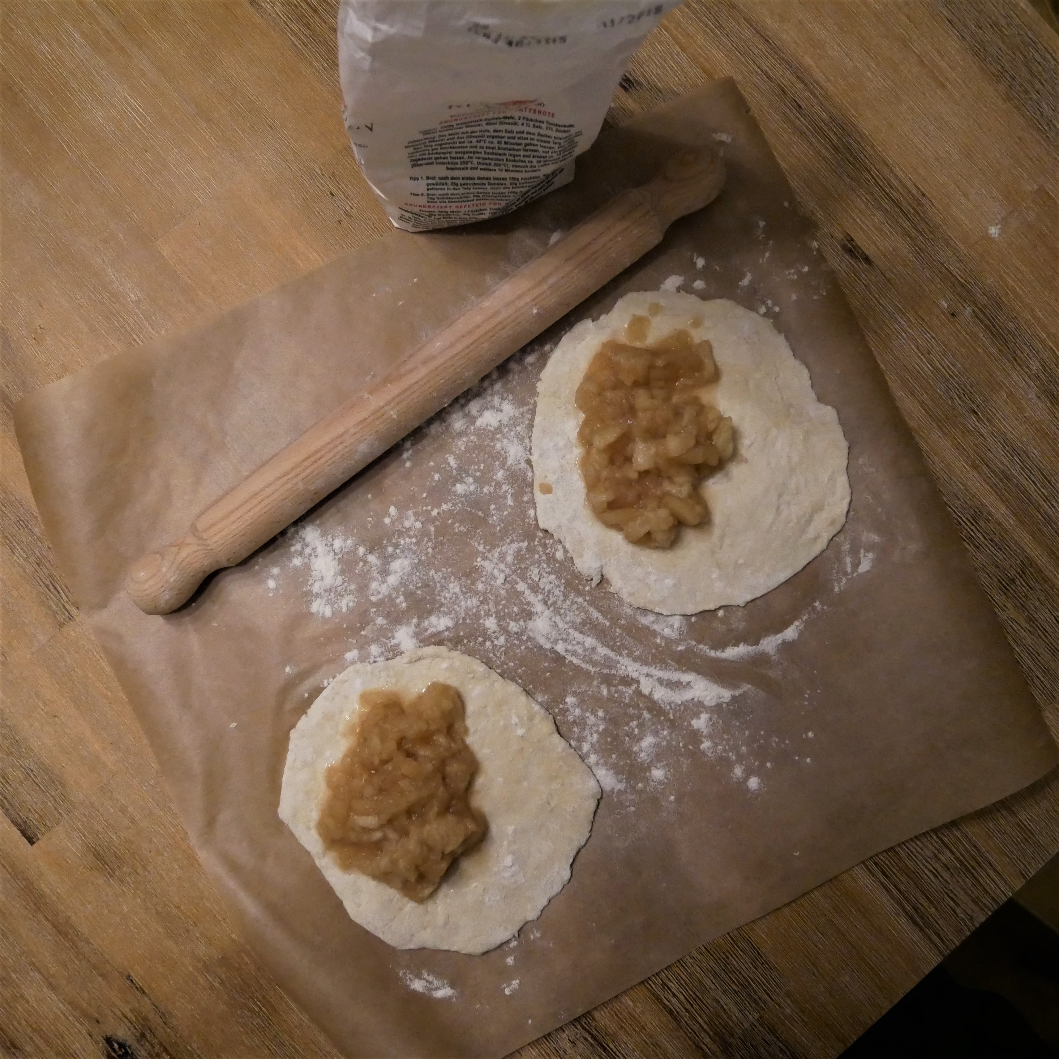 - Put some flour on a baking sheet and place the slices. Put some of the apple jam in the middle of the slices and close as shown in the pictures. Press the edges with a fork to close the pastry (picture below).